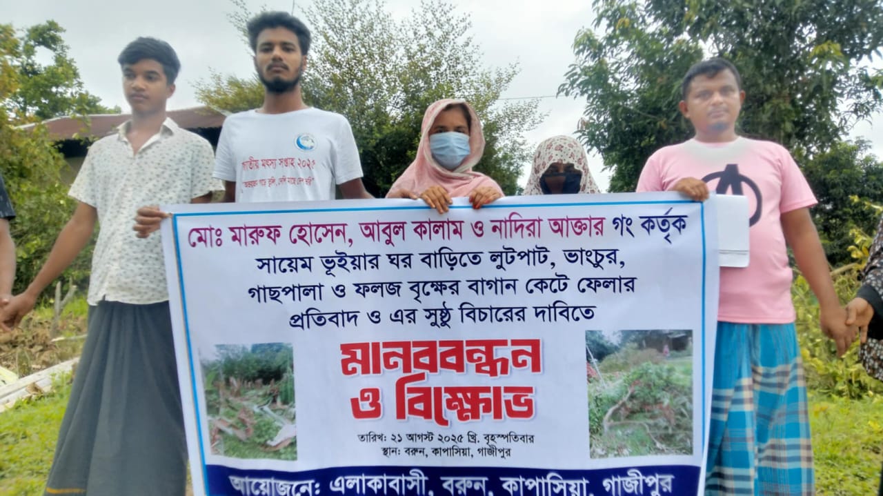 গাজীপুরের কাপাসিয়ার বরুন গ্রামে বৃহস্পতিবার দুপুরে ভাংচুর, লুটপাট ও বসতভিটা থেকে জোর পূর্বক গাছ কেটে নেওয়ার প্রতিবাদে মানববন্ধন ও বিক্ষোভ করেছে ভুক্তভাগী পরিবারের সদস্যরা। এ বিষয়ে বিচার চেয়ে বুধবার রাতে কাপাসিয়া থানায় একটি লিখিত অভিযোগ দিয়েছেন ভুক্তভাগী পরিবারের সদস্য মো.সায়েম ভূইয়া। সায়েম ভূইয়া জানান, তার নানা সিরাজুল ইসলাম ঘরজামাই হিসেবে শশুর বাড়ি বরুন গ্রামে বসবাস করতেন। সিরাজুল ইসলাম প্রথম স্ত্রী খাতুন্নেসা পৈত্রিক সূত্র ৪০ থেকে ৪২ বিঘা জমির মালিক ছিলেন। তাদের সংসারে ২ জন ছেলে ও ৪ জন মেয়ে জন্ম গ্রহণ করেন। পরবর্তী সময় সিরাজুল ইসলাম দ্বিতীয় বিয়ে করলে ওই সংসারে ৪ জন ছেলে ও ৮ জন মেয়ে জন্ম গ্রহণ করেন। এ সময় সিরাজুল ইসলাম তার প্রথম স্ত্রীর সাথে চালাকি করে বেশ কিছু জমি নিজের নামে লিখে নেন। সিরাজুল ও তার দুই স্ত্রী মারা গেলে ১ম স্ত্রীর সানোয়ারা ১২ থেকে ১৩ বিঘা জমি উত্তরাধিকার সূত্রে মালিকানা পেল এবং ৫ থেকে ৬ বিঘা জমি দখল নিয়ে বসবাস করছেন। কিন্তু ২য় স্ত্রীর সানোয়ারা দখলীয় জমি ও বসতভিটা থেকে তাদেরকে উচ্ছেদ করতে একে একে পনেরোটি মামলা দিয়ে হয়রানি করছেন। এমনকি যখন তখন তাদের বসত ভিটা ও আশপাশের এলাকার গাছপালা কেটে নিয়ে যাচ্ছেন। এসব বিষয়ে স্থানীয় গণ্যমান্য ব্যক্তিদের নিয়ে বহু শালিশ বৈঠক করেও কোন সমাধান পাচ্ছে না তারা। এসব জমি সংক্রান্ত বিরোধে আদালতে একাধিক মামলা চলমান থাকলেও বুধবার দুপুরে সিরাজুলের ২য় স্ত্রীর ছেলে মারুফ হাসান (৪০), মেয়ে নাদিরা আক্তার (৩০) ও তার স্বামী আবু কালাম জারপূর্বক প্রায় লাখ টাকা মূল্যর ৩৫ থেকে ৪০ টি ফলজ ও বনজ গাছ কেটে ফেলে এবং বসতবাড়ির সিসি ক্যামেরা ভেঙ্গে ঘরবাড়িতে ভাঙচুর, লুটপাট করে নগদ টাকা ও স্বর্ণালংকার নিয়ে যায়। এ সময় জরুরি সেবা ৯৯৯ এ ফোন দিলে কাপাসিয়া থানা পুলিশ ঘটনাস্থলে গিয়ে তাদেরকে গাছ কাটতে নিষেধ করেন। এ সময় তারা প্রতিপক্ষের লোকজনকে দেখে নেওয়ার এবং জীবন নাশের হুমকি দিয়ে চলেযান। এমতাবস্থায় ভুক্তভাগীরা নিরাপত্তাহীনতায় ভুগছেন।