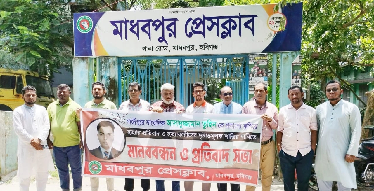 গাজীপুরে সাংবাদিক তুহিন হত্যার প্রতিবাদে মাধবপুর প্রেসক্লাবের মানববন্ধন