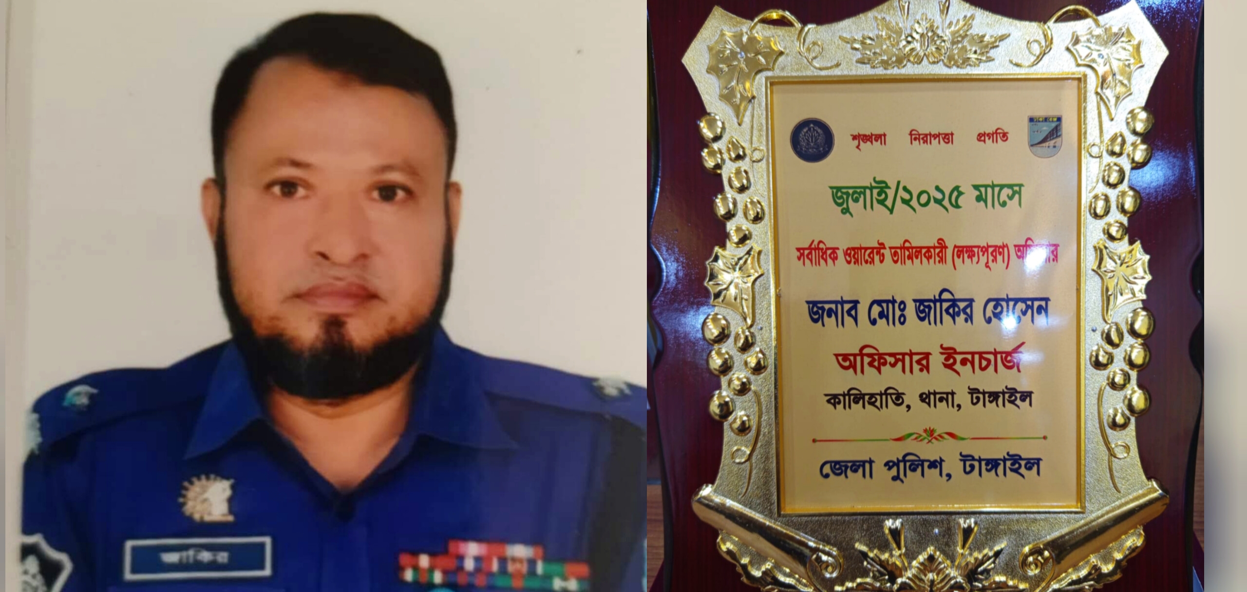 টাঙ্গাইল জেলার আইন-শৃঙ্খলা রক্ষায় বিশেষ অবদান রাখার স্বীকৃতিস্বরূপ কালিহাতী থানার অফিসার ইনচার্জ (ওসি) মোঃ জাকির হোসেন জুলাই/২০২৫ মাসে সর্বাধিক ওয়ারেন্ট তামিলকারী অফিসার হিসেবে নির্বাচিত হয়েছেন। জেলা পুলিশের পক্ষ থেকে তাকে সম্মাননা ক্রেস্ট প্রদান করা হয়।