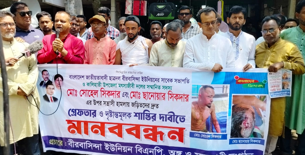 টাঙ্গাইলের কালিহাতী উপজেলার বীরবাসিন্দা ইউনিয়ন ছাত্রদলের সাবেক সভাপতি সোহেল সিকদারের উপর সন্ত্রাসী হামলার প্রতিবাদ ও শাস্তির দাবিতে মানববন্ধন কর্মসূচি পালিত হয়েছে। শনিবার ( ১২ এপ্রিল ) সকালে বীরবাসিন্দা ইউনিয়ন বিএনপি ও এর সহযোগী অঙ্গ সংগঠনের উদ্যোগে কস্তুরীপাড়া বাজারে এ মানববন্ধন কর্মসূচি পালন করা হয়।