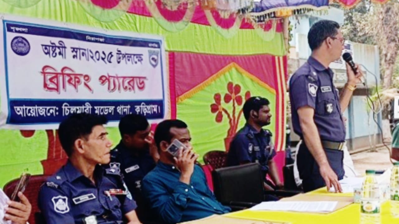 কুড়িগ্রামে ব্রহ্মপুত্র নদে মহা অষ্টমী স্নান উপলক্ষে আইনশৃঙ্খলা পরিস্থিতি স্বাভাবিক রাখতে চিলমারী মডেল থানা পুলিশের আয়োজনে ব্রিফিং ও প্যারেড অনুষ্ঠিত হয়েছে।