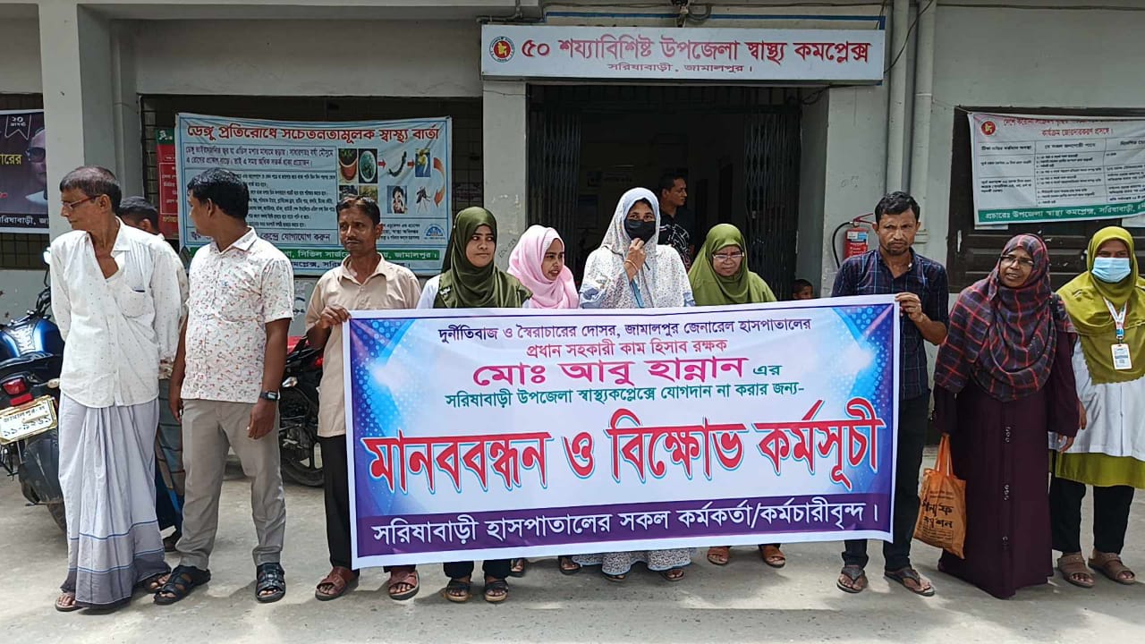 মানববন্ধনে বক্তারা বলেন , আবু হান্নান জামালপুর জেনারেল হাসপাতালে কর্মরত থাকাকালীন ক্ষমতার অপব্যবহার করে বিভিন্ন দুর্নীতির সঙ্গে জড়িত ছিলেন। তার বিরুদ্ধে অভিযোগ রয়েছে যে, তিনি কর্মস্থলে বিভিন্ন সময় কর্মকর্তা ও কর্মচারীদের সঙ্গে খারাপ আচরণ করেছেন এবং স্বৈরাচার সরকারের একজন দোসর হিসেবে কাজ করেছেন। এ প্রেক্ষিতে, তার সরিষাবাড়ী উপজেলা স্বাস্থ্য কমপ্লেক্সে যোগদানের আদেশ বাতিলের দাবি জানানো হয়।