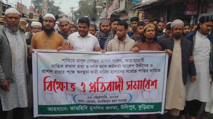 রফিকুল ইসলাম রফিক, কুড়িগ্রাম প্রতিনিধিঃ কুড়িগ্রামের উলিপুরে তাওহিদি মুসলিম জনতার ব্যানারে বিক্ষোভ ও প্রতিবাদী সমাবেশ অনুষ্ঠিত হয়েছে। আল্লাহ তায়ালা ও রাসূল (সা:)কে কটুক্তিকারী রাখাল রাহা, গালিব সহ তাদের দোসর বলে