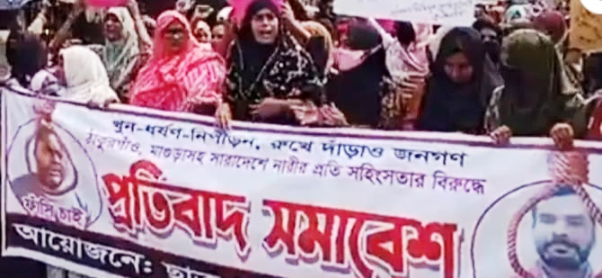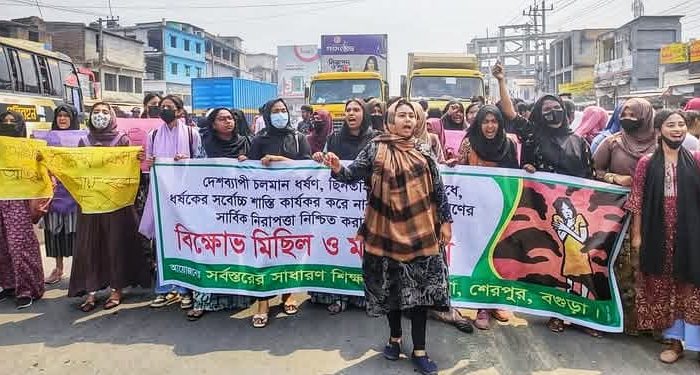 শেরপুর,(বগুড়া) প্রতিনিধি: দেশব্যাপী নারীদের বিরুদ্ধে সহিংসতা, নিপীড়ন, ধর্ষণ, অনলাইনে হেনস্তা এবং আইনশৃঙ্খলা পরিস্থিতির অবনতি ও বিচারহীনতার প্রতিবাদে বগুড়ার শেরপুরে মানববন্ধন করেছে সর্বস্তরের সাধারণ নারী শিক্ষার্থী । সোমবার (১০ মার্চ) বেলা
