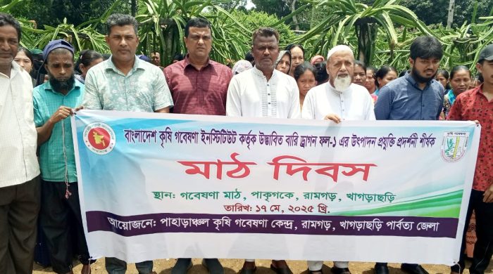 সাইফুল ইসলাম, রামগড়ঃ বাংলাদেশ কৃষি গবেষণা ইনস্টিটিউট কর্তৃক উদ্ভাবিত বারি ড্রাগন ফল এ-র উৎপাদন প্রযুক্তি প্রদর্শন কর্মসূচির আওতায় মাঠ দিবস পালিত হয়েছে। শনিবার (১৭ মে) রামগড় পাহাড়াঞ্চল কৃষি গবেষণা কেন্দ্রের