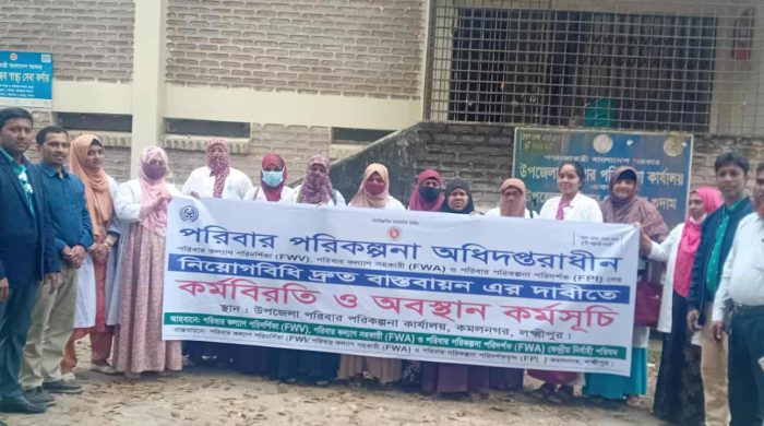 মোঃ নুর হোসেন,কমলনগর (লক্ষ্মীপুর) প্রতিনিধি: লক্ষ্মীপুরের কমলনগর উপজেলা পরিবার পরিকল্পনা বিভাগের বিভিন্ন স্তরের কর্মকর্তা কর্মচারীদের উদ্যোগে একদফা দাবিতে মানববন্ধন কর্মসূচি পালন করা হয়েছে। (আজ) মঙ্গলবার সকাল দশটায় কমলনগর উপজেলা স্বাস্থ্য