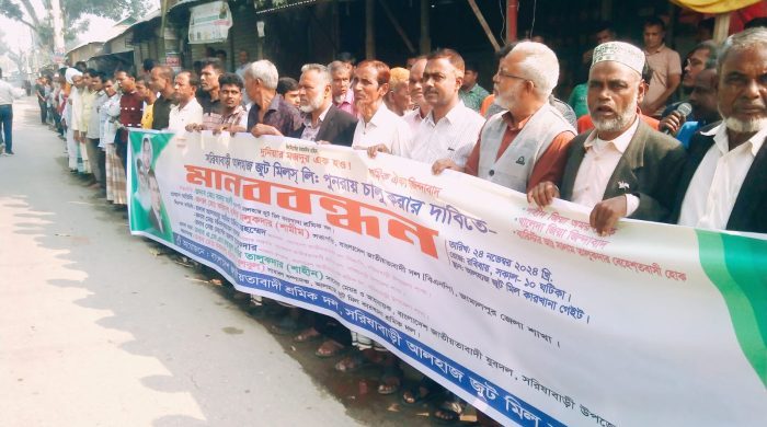 লিমন মিয়া, সরিষাবাড়ী(জামালপুর) প্রতিনিধিঃ জামালপুরের সরিষাবাড়ীতে বন্ধ হয়ে যাওয়া ঐতিহ্যবাহী আলহাজ জুট মিল পুনরায় চালুর দাবিতে মানববন্ধন কর্মসূচি অনুষ্ঠিত হয়েছে। রোববার (২৪ নভেম্বর) সকালে মুক্তিযোদ্ধা সংসদ সংলগ্ন দিগপাইত-ভুয়াপুর সড়কে
