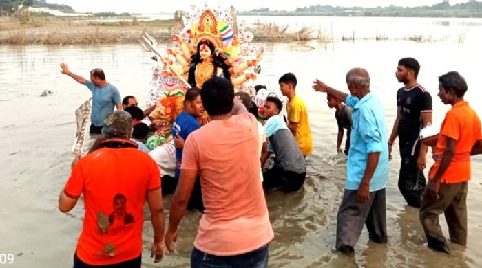 পঞ্চগড় জেলা সংবাদদাতাঃ পঞ্চগড় বোদা উপজেলার গোবিন্দ জিউ মন্দিরে প্রতিমা বিসর্জনের মধ্য দিয়ে শেষ হলো সনাতন ধর্মাবলম্বীদের দুর্গোৎসব। নাচ গানের মধ্য দিয়ে রাজারদিঘি পুকুরে প্রতিমা বিসর্জন দেন ভক্তরা। এ সময়