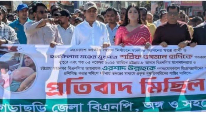 হাদি ও এরশাদ উল্লার ওপর হামলার প্রতিবাদে খাগড়াছড়িতে বিএনপির বিক্ষোভ মিছিল